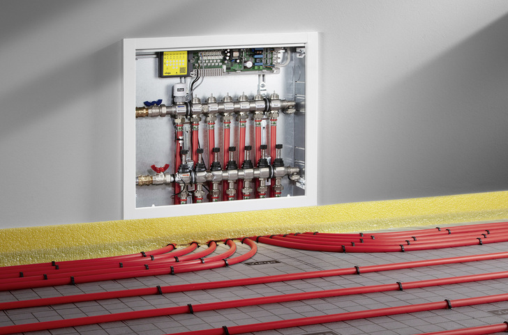 Die Regelung „Fonterra Heat Control“ von Viega ermöglicht einen einfachen hydraulischen Abgleich der Fußbodenheizung in Großobjekten. Das geht auch, wenn es keine genauen Kenntnisse über die jeweiligen Rohrlängen oder Rohrdimensionen der einzelnen Heizkreise gibt: Die einfach nachzurüstende Regelung stellt jeden einzelnen Heizkreis eines Flächenheizsystems selbsttätig bedarfsgerecht ein. Die Steuersignale dafür liefern der Raumthermostat und Anlegefühler in Vor- und Rücklauf. In Abhängigkeit von den tatsächlichen Wärmelasten wird das Wärmeverteilsystem so permanent hydraulisch abgeglichen. Das sorgt für eine komfortable Wärmeversorgung bei gleichzeitigen Energieeinsparungen von bis zu 20 %. Der UP-Raumthermostat lässt sich dabei in handelsübliche Schalterprogramme im Standardmaß 50 x 50 mm integrieren.