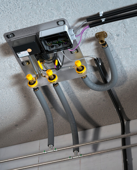 Mit der „AquaVip-Duscheinheit elektronisch“ präsentiert Viega erstmals eine Armatur für öffentliche Sanitärräume – auch im Bestand. Sie kann individuell per App programmiert werden, um z. B. bei drohender Stagnation den Erhalt der Trinkwassergüte durch Hygienespülungen zu unterstützen. Die bedarfsgerechte Parametrierung trägt den unterschiedlichen Nutzungsszenarien von öffentlichen Duschanlagen Rechnung: Der Zeitpunkt der Spülung ist z. B. per Kalender an bestimmten Wochentagen oder in frei wählbaren Intervallen festzulegen. Auch die Spüldauer lässt sich auf die jeweiligen Gegebenheiten anpassen. Der standardmäßig integrierte Temperatursensor ermöglicht sowohl für Warm- als auch für Kaltwasser eine passgenaue Spülung, bis die vorgegebene Zieltemperatur erreicht ist. Die Parametrierung erfolgt per Smartphone über die Hygiene-Control-App des Unternehmens. Dafür wird als Kommunikationsschnittstelle ein Bluetooth-Modul benötigt. Die eingestellten Parameter sowie die durchgeführten Spülvorgänge werden in der App prozesssicher abgespeichert und können direkt als Nachweis des bestimmungsgemäßen Betriebs geführt werden. Eine automatische Alarmmeldung gibt an, wenn definierte Hygieneindikatoren – wie die Trinkwassertemperatur – nach der Spülung nicht erreicht werden. Die auf einer Grundplatte vormontierte Technik wird weitestgehend unsichtbar in der abgehängten Decke oder hinter der Wand verbaut. Sichtbar bleiben lediglich die Kopfbrause an der Decke und das im Durchmesser nur 4,5 cm große und mit LED-Beleuchtung ausgestattete Bedienelement an der Wand.