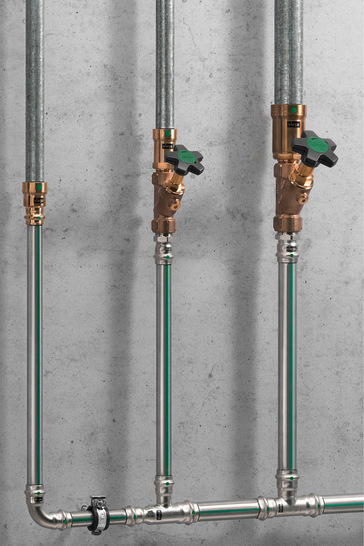 Viega hat das Pressverbindersystem Megapress um Übergangsstücke mit Innen- und Außengewinde erweitert. Die Komponenten aus bleifreier Siliziumbronze ermöglichen den schnellen Austausch oder nachträglichen Einbau von Armaturen in bestehenden Trinkwasser-Installationen aus dickwandigem, verzinktem Stahlrohr ohne Gewindeschneiden oder den Einsatz von Spezialverschraubungen. Ein definierter Schiebebereich erleichtert die Montage. Für die Sicherheit sorgt die SC-Contur, die nicht verpresste Verbindungen bei der Dichtheitsprüfung sichtbar macht. Die Übergangsstücke sind in je elf Varianten mit Pressanschlüssen in den Dimensionen ½ bis 2" verfügbar. Dank erweiterter DVGW-Zertifizierung für Rohrleitungen im industriellen Umfeld können sie auch auf dickwandige Edelstahlrohre aus den Werkstoffen 1.4301, 1.4306, 1.4307, 1.4401, 1.4404, 1.4541, 1.4550 und 1.4571 gemäß DIN EN 10216‑5 bzw. DIN EN 10217‑7 verpresst werden.