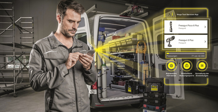 Die Services umfassen unter anderem die Vor-Ort-Einrichtung und Inbetriebnahme der smarten Pressmaschinen „Pressgun 6 Plus“ sowie der ebenfalls angebotenen Tracker für Fremdwerkzeuge, eine Schulung, Beratung über die Viega-Hotline und Wartungsservices für die Viega-Werkzeuge und das entsprechende Zubehör. Der vollständige Zugriff erfolgt browsergestützt beispielsweise aus dem Büro des Handwerksbetriebes. Ausgewählte Funktionalitäten zu den Pressmaschinen stehen über die App auch auf dem Smartphone zur Verfügung.