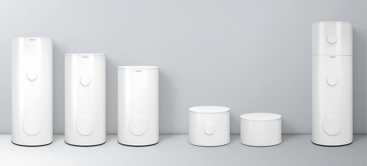 Speziell für Anwendungen mit Wärmepumpen wurde das Speicherprogramm Vitocell Modular entwickelt. Es umfasst Speicher-Wassererwärmer (200, 250 und 300 l) sowie um 360° drehbare Heizwasser-Pufferspeicher (50 und 75 l), die sowohl allein eingesetzt als auch kombiniert werden können. Insgesamt sind sechs Kombinationen erhältlich, die aufeinandergesetzt werden und dadurch eine Aufstellfläche von weniger als 0,5 m² beanspruchen. In den Behältern integrierte, stabile Tragegriffe erleichtern Einbringung und Transport.