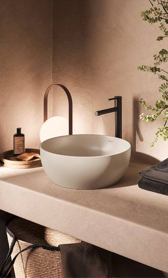 Vitra Bad recycelt: Die Aufsatzschale „Outline“ besteht aus sogenannter Re-Ceramic. Das heißt, sie wurde ausschließlich aus aussortierter und zerbrochener Sanitärkeramik gefertigt, die zerkleinert und wiederaufbereitet worden ist. Durch den Einsatz des recycelten Rohstoffs werden die Umweltauswirkungen der Aufsatzschalen minimiert. Im Vergleich zur Produktion herkömmlicher Aufsatzschalen spart Vitra Bad bei der Herstellung jeder Schale 5 kg Rohstoffe und 2,48 kWh Strom. Das entspricht einer Senkung des Materialverbrauchs um 36 Prozent und des Stromverbrauchs um 38 Prozent.