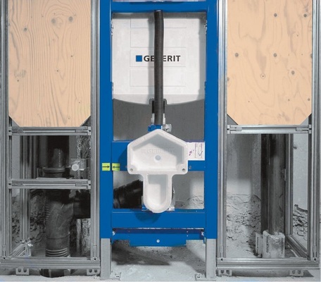 Das Duofix Wand-WC-Element ist in der Standard-Ausführung für individuelle Sitzhöhen von 41 bis 49 cm geeignet; je nach Körpergröße, individuellen Bedürfnissen und persönlichen Wünschen. Konzipiert ist es vor allem für die Montage in die Geberit Systeme Duofix Systemwand, GIS-Systemwand, als Einzelelement und in Metall- und Holzbauständerwänden. Die Höhenverstellung der WC Keramik erfolgt nach dem Einbau über eine Spindel, die verdeckt hinter der Betätigungsplatte zugänglich ist. Zum Lieferumfang gehört ein flexibler Abgangsbogen (90/110 mm oder 90/90 mm) für den horizontalen oder vertikalen Abwasseranschluss. Das Abdeckschild aus Edelstahl, als optische Einheit im Maß auf die Betätigungsplatte abgestimmt, deckt die Aussparungen in der gefliesten Wand ab. Den Ausgleich von Unebenheiten und Schallschutz ermöglichen zwei Schallschutzmatten. Der flexible Abgangsbogen mit PP-Faltenbalg und PE-Anschlussstutzen wird durch die zusätzlich mitgelieferte Schelle am Element fixiert. Das Element kann seitlich mit Unterkonstruktionen zur Aufnahme der Stütz-Halte-Griffe nachgerüstet werden.