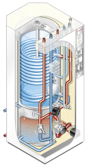 Der Kombispeicher WKS 300/100 LE #4 vereint Trinkwasserspeicher (300 l), Puffer (100 l) sowie Regelungstechnik in einem kompakten Gehäuse und benötigt nur 0,54 m2 Standfläche. Abgestimmt ist er auf die Luft/Wasser-Wärmepumpen Aeroblock WAB 8/11. Zu den integrierten Speicher-Features gehören u. a.: Hocheffizienz-Umwälzpumpe, 3-stufige Rohrheizung (3 x 2,3 kW), LAN-Anschluss sowie Wärmepumpenregler WAB mit Farbdisplay. Die Komposit-Wärmedämmung (Vakuumisolation) der Speicher sowie die Wärmedämmung aller Einzelkomponenten sorgt für minimale Wärmeverluste.