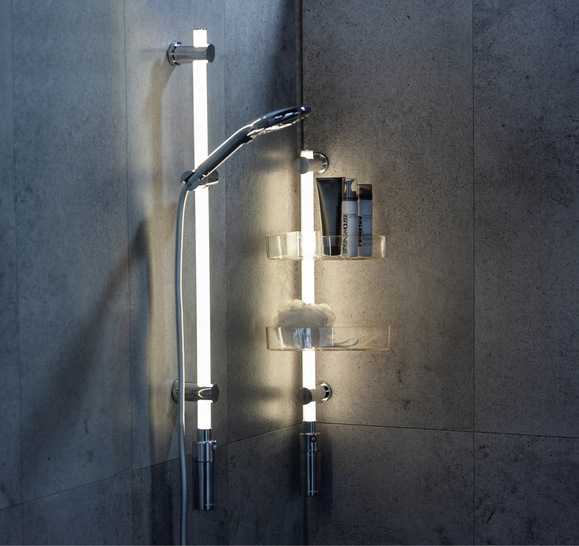 Dem Duschen im Halbdunkel setzt Wenko mit einer LED-Duschstange und einem LED-Duscheckregal ein Ende. Mit warmweißem Licht sorgen die beiden Objekte für mehr Helligkeit im Duschbereich. Befestigt wird die LED-Duschecke ganz ohne Bohren mit dem Klebesystem Power-Loc. Es ist rückstandsfrei entfernbar und hinterlässt keine Schäden an den Fliesen. Das System lässt sich per Schalter aktivieren und verfügt über einen Bewegungsmelder. Letzterer erkennt sofort, wenn sich eine Person nähert, und leuchtet die Duschkabine automatisch hell aus. Das bedeutet Komfort und Sicherheit zugleich. Ein starker, wasserdichter Lithium-Ionen-Akku mit Micro-USB-Anschluss gewährleistet die Versorgung der LEDs mit Strom. Zum Laden wird die Akkueinheit einfach abgeschraubt und an der Steckdose aufgeladen. Danach versorgt sie die ca. 58 cm lange Leuchtröhre bis zu 20 Wochen lang mit Energie.