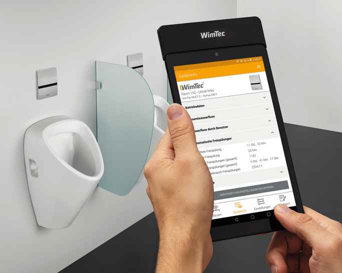 Die Einstellung erfolgt entweder in gewohnter Weise direkt an der Armatur mittels Regler und Schalter oder mit „WimTec Remote“. Es handelt sich um ein Infrarot¬-Tablet, das ermöglicht das wertgenaue Einstellen und Steuern sämtlicher Funktionen, ohne die Urinalsteuerung öffnen zu müssen sowie das Auslesen aller relevanten Geräteinformationen. Diese können zur Anlagendokumentation über eine Export-Funktion als PDF- oder CSV-Datei gespeichert werden. Der Datenaustausch erfolgt über die integrierte microSD-Karte oder über einen geschützten Bereich auf my.wimtec.com.