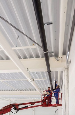 In jeder Halle sind jeweils zwei Sammel- und zwei Fallleitungen eingeplant. Die horizontalen Entwässerungsleitungen setzen die Monteure aus Rohrstücken unterschiedlicher Dimensionen zusammen. Die mit Unterdruck durchfließende Wassermenge summiert sich im Verlauf der Rohrleitung mit jedem der insgesamt acht angeschlossenen Dachwassereinläufe auf. Daher variieren die Rohrdurchmesser von DN 70 bis hin zu DN 300. Die Verarbeitung und Anbringung der Rohre folgt einem festen Ablauf: Zuerst werden die PE Rohre maschinell abgelängt. Danach werden die Rohrhälften mit dem Elektrohobel plan zusammengeführt und dann an dem Schweißspiegel stumpf verschweißt. Auf der Hebebühne unter der Decke ist Teamwork in 15 m Höhe gefragt: Zwei Monteure verbinden mit einem Elektromuffenschweißgerät die 10 bis 12 m langen Rohrleitungsstücke nach und nach zu der gesamten Entwässerungsleitung von 140 m Länge.