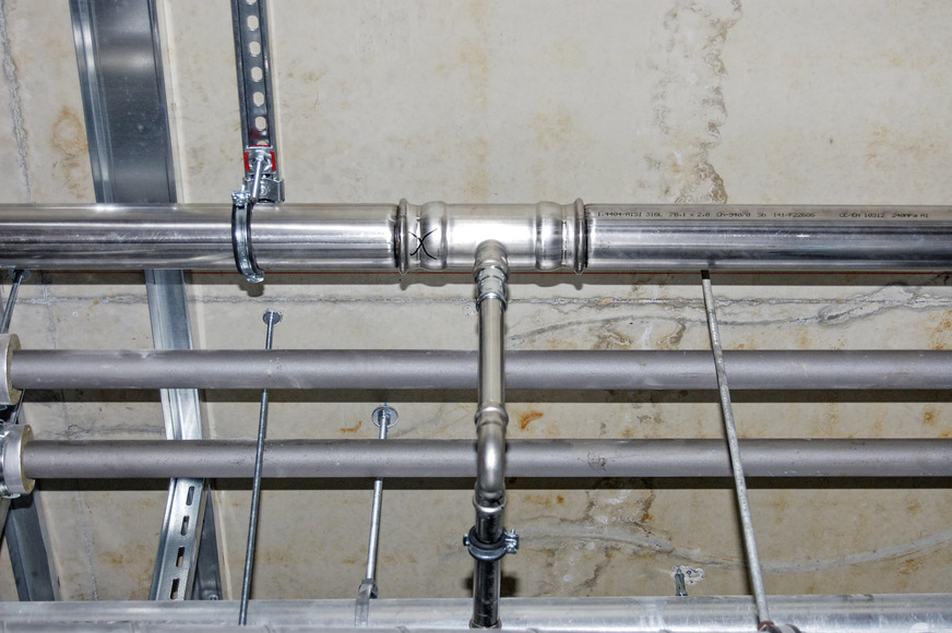 Für die Trinkwasserinstallation kam vor allem das Edelstahl-Rohrleitungssystem NiroSan von Sanha zum Einsatz. Für dessen Formteile wird der Werkstoff 1.4404 verwendet, der aufgrund eines Molybdängehaltes von mindestens 2,3 % und des niedrigen Kohlenstoffanteils besser gegen Korrosion geschützt sein soll als der konventionelle Werkstoff 1.4401. Sanha liefert das System bis zu einem Rohraußendurchmesser von 108 mm, der Betriebsdruck wird mit maximal 16 bar angegeben. In der Sporthalle werden für Kaltwasser die Dimensionen zwischen 15 und 88,9 eingesetzt, für Warmwasser 28 bis 76,1. Rund 1700 m Rohr und 1230 Fittings kommen für die gesamte Installation zusammen. Alle Rohrtrassen, die sich in öffentlich zugänglichen Bereichen befinden, werden nach dem Abschluss der Montage durch abgehängte Decken „unsichtbar“.