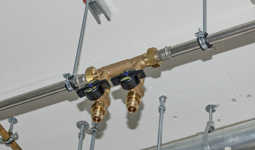 Für sämtliche Anschlüsse der Verbrauchsstellen wählte man die Systempressfittings 3fit-Press, die zusammen mit den Mehrschicht-Verbundrohren MultiFit-Flex eingesetzt werden. Die Fittings bestehen aus bleifreier Siliziumbronze CuSi bzw. PPSU und entsprechen daher den Vorgaben der Trinkwasserverordnung. Zusammen mit den biegsamen, vorisolierten Verbundrohren eignen sie sich für alle Verteilleitungen. Diese Flexibilität vereinfachte auch die Installation für die Waschbecken sowie in den Vorwandelementen für WCs und Urinale. Nach der Kontrolle der Pressstellen und der Druckprobe sind lediglich die Fittings zu dämmen, damit eine durchgängig regelkonforme Umsetzung erzielt wird. Es stehen die Dimensionen von 16 bis 63 mm zur Verfügung. Abhängig von der Betriebstemperatur wird der Betriebsdruck mit 10, 13 oder 16 bar angegeben. Grundsätzlich sind 3fit-Press-Fittings für einen Temperaturbereich von –30 °C bis zu 70 °C vorgesehen. Die Übergänge zwischen den Systemen NiroSan und 3fit-Press wurden mit Fittings aus dem Sanha-Produktsortiment gelöst.