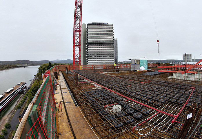 „Die Vorfertigung trug wesentlich zur Einhaltung der getakteten Rohbautermine bei, da die Elemente termingerecht geliefert und die Verschweißungen auf der Schalung auf ein Minimum reduziert wurden“, erläutert Schwarz. „Vor Ort waren keine kleinteilige Materiallogistik und Vorhaltung von Einzelteilen notwendig. Das Montagepersonal konnte durch die Vorfertigung kontinuierlich und effektiv geplant eingesetzt und vorgehalten werden.“ Das leichte Gewicht des eingesetzten Systems vereinfachte das Handling auf der Baustelle zusätzlich.