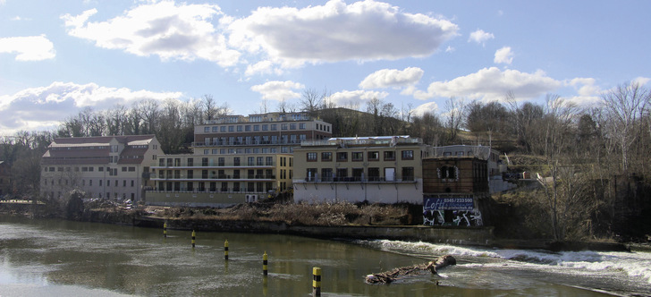 Der im Folgenden beschriebene Neubau eines Mehrfamilienhauses bildet den Lückenschluss zwischen der oberen und unteren ehemaligen Papiermühle. Er wurde mit einer Brutto-Grundfläche von etwa 2188 m² (BGF gem. DIN 277) in zweischaliger Massivbauweise errichtet und bietet Raum für sieben Wohneinheiten. Die Wohnungen mit einer Fläche von jeweils ca. 150 bis 200 m² sind großzügig dimensioniert und mit Dachterrassen oder Balkonen hochwertig ausgestattet. Je zwei mit 10 kW Stromlademöglichkeit versehene Tiefgaragenstellplätze pro Einheit zählen ebenso zum Komfortumfang wie ein Fahrstuhl und die Nutzung der