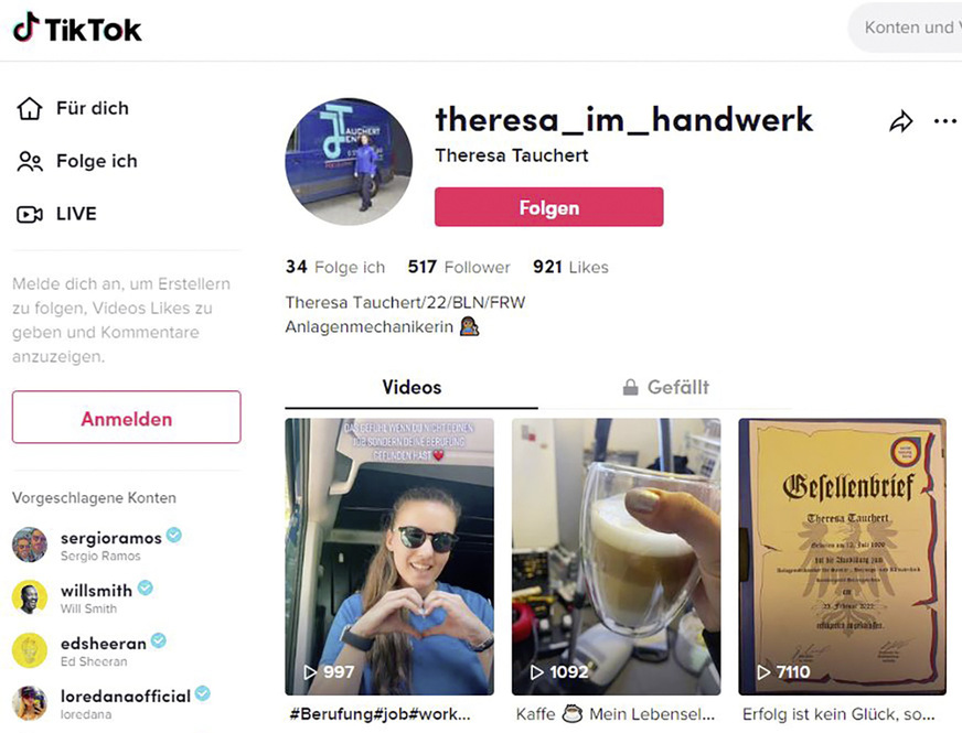 „Wir folgen dir schon länger“, posten junge Frauen und Männer an Theresa Tauchert. Sie teilen ihr zum Beispiel auf Instagram mit: „Jetzt haben wir auch mit der Ausbildung begonnen.“ Theresa ist wie ihre Kolleginnen Sandra Hunke oder Lena Hinz in den sozialen Medien zum Vorbild geworden. Wer der jungen Anlagenmechanikerin aus Bad Freienwalde an der Oder (Brandenburg) zum ersten Mal begegnet, der merkt schnell: Sie ist auch im richtigen Leben eloquent und selbstbewusst und gibt sich ganz natürlich. Eigenschaften, die auch ihre Online-Community wertschätzt.