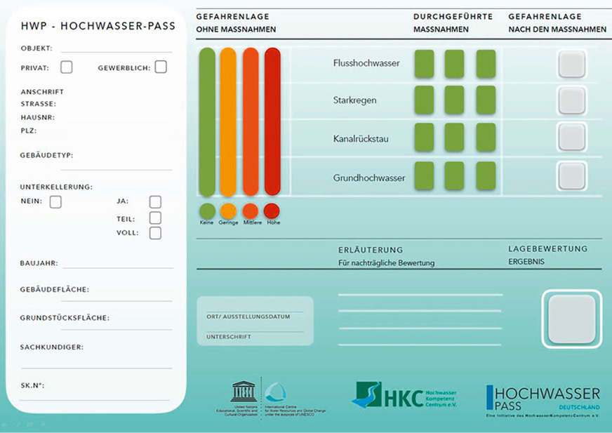 Der Hochwasserpass des Hochwasser-Kompetenz-Centrums (HKC) hilft dabei herauszufinden, ob das eigene Haus ausreichend vor Hochwasser, Starkregen und Kanalrückstau geschützt ist und welche Schutzmaßnahmen effektiv sind. Dazu wird ein Fragebogen ausgefüllt, der eine erste Beurteilung der Risikolage möglich macht.