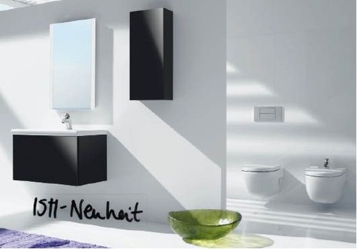 Badmöbel: Serie Essence, Oberflächen hochglänzender Lack Weiß, Creme, Schwarz, Echtholzfurnier Schiefer und Walnuss.
