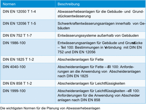 Die grundsätzlichen Auslegungsregeln zum Schmutzwasserabfluss (Qs) oder der Förderhöhe finden sich in der DIN EN 12056 sowie DIN 1986-100. Für Abscheideranlagen gelten zusätzlich die fallspezifischen Auslegungsregeln wie beispielsweise bei:
