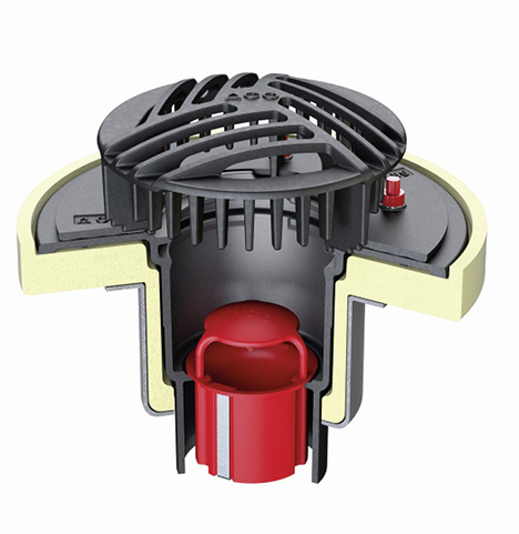 Mit dem Flachdachablauf Passavant hat Aco Haustechnik einen Ablauf aus Gusseisen für die Freispiegelentwässerung entwickelt. Er erfüllt die Anforderungen der Feuerwiderstandsklassen R 30 bis R 120 schon bei einer Mindeststärke des Flachdaches ab 150 mm. Der Ablauf in Verbindung mit der Brandschutzkartusche sorgt für integrierten Brandschutz. „Das heißt, egal welche Rohrleitung angeschlossen wird (Kunststoff, Stahl oder Gusseisen): Brandschutz ist immer gewährleistet“, betont der Entwässerungsspezialist. Wird der Flachdachablauf in ein gedämmtes Dach eingebaut und ist Brandschutz gefordert, kommt der Brandschutz-Isolierkörper Fit-in zum Einsatz. Dieser kommt ohne zusätzliches Hitzeschild aus. Zur Auswahl stehen zwei Oberteile und zwei Rostsortimente für insgesamt sechs Ablauf-Varianten (DN 70/100/125/150 mit 90° und DN 70/100 mit 1,5° Stutzenneigung). Und da es für die Kernlochbohrung (außer bei DN 125/150) nur noch ein relevantes Maß gibt – Durchmesser 160 mm –, vereinfacht sich die Erstellung des Durchbruchplanes.