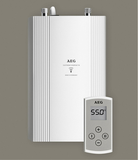 Mit einer umschaltbaren Versorgungsleistung von maximal 11 oder 13,5kW ist der elektronisch geregelte Durchlauferhitzer DDLE Kompakt 11/13 von AEG Haustechnik speziell für den Bedarf von Küchen ausgelegt. Das Gerät mit verkalkungsunempfindlichem Blankdraht-Heizsystem bietet eine stufenlos einstellbare und gradgenaue Auslauftemperatur zwischen 30 und 60°C bei minimalem Ausstoßverlust. Der DDLE Kompakt 11/13 verfügt über eine elektronische Lufterkennung und ein Sicherheitssystem, das bei einer Störung der Wasserversorgung die Elektronik sofort abschaltet. Mit Geräteabmessungen von 29×17×8,5cm lässt er sich unter dem Spültisch so montieren, dass ausreichend Stauraum für Abfallbehälter zur Mülltrennung und für Reinigungsutensilien bleibt. Zur Ausführung DDLE Kompakt 11/13 FB gehört serienmäßig eine Fernbedienung (IPX7), mit der sich die Warmwassertemperatur durch Fingertipp auf das Plus- oder Minus-Bedienfeld einstellen lässt. Zusätzlich lassen sich zwei Temperaturen dauerhaft programmieren. Das Gerät ist solargeeignet für Zulauftemperaturen bis 70°C.