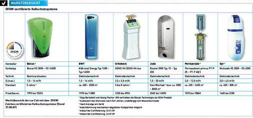 Die nachweisliche Verringerung von Kalksteinbildung in Rohrleitungen und Boilern spricht für den Einsatz DVGW-zertifizierter Wasserbehandlungsgeräte. Natürlich vorkommendes Wasser enthält immer gelöste Salze. Probleme in den Rohrleitungen entstehen besonders bei der Erwärmung des Wassers: Mit steigenden Temperaturen nimmt die Konzentration an Kohlensäure ab, das Gleichgewicht von Kalk- und Kohlensäure verschiebt sich vom löslichen Kalk (Kalziumhydrogenkarbonat) zum schwer löslichen Kalk (Kalziumkarbonat). Kalziumkarbonatgesättigtes, „hartes“ Wasser bildet hartnäckige Beläge an Wärmeübertragungsflächen sowie an Rohr- und Boilerwänden. Je nach Werkstoff und Oberflächenstruktur verläuft die Belagbildung in unterschiedlicher Geschwindigkeit. Eine glatte, organische Oberfläche eines Kunststoffrohrs beispielsweise hemmt die Kalkablagerung stärker, als die raue, anorganische Metalloberfläche eines Stahlrohrs. Aber auch Kunststoffrohre werden mit einer Kalkschicht überzogen, die jedoch schlecht anhaftet, halbschalenförmig abplatzt und zu infarktartigen Verstopfungen im Installationsnetz führen kann. Neben den klassischen Methoden der chemischen Wasserbehandlung bieten sich heute auch Geräte an, die mithilfe von Elektrodentechnik oder der Biomineralisation Nanokristallisationszentren in großer Zahl erzeugen. Solche Geräte sind in der Lage, das beim Erhitzen stark ansteigende Potenzial der Kalkausfällung abzubauen. Bei der Biomineralisation erfolgt die Härte-Stabilisierung durch heterogene Kristallkeimbildung auf einer sehr großen, modifizierten Kunstharzoberfläche. Die Wasserzusammensetzung bleibt dabei unverändert. Geräte mit Elektrodentechnik werden derzeit von BWT, Grünbeck, Judo, Permatrade und Syr produziert und vertrieben. Die Härte-Stabilisierung beruht auf der elektrolytischen Erzeugung von Kristallisationskeimen aus gelöstem Kalk an großen Elektrodenoberflächen. Kalk lagert sich an den temporär negativ geladenen Teilchen an und wird durch eine rhythmische Umpolung in Form von winzigen Nanokristallen wieder abgelöst. Doch anstatt sich in Rohrleitungen, Armaturen oder Boilern abzulagern, wird der an den Nanokristallen haftende Kalk mit dem Wasser ausgespült. Wie bei der Biomineralisation bleibt auch bei der Elektrodentechnik die Wasserzusammensetzung unverändert. Allerdings entstehen hier wie auch bei der Biomineralisation Folgekosten: Während dort das Katalysatormaterial nach gegebener Zeit ausgetauscht werden muss, sollte bei Geräten mit Elektrodentechnik die Elektrolyse-Zelle nach 400 bis 600 m³ Wasserdurchlauf ersetzt werden.