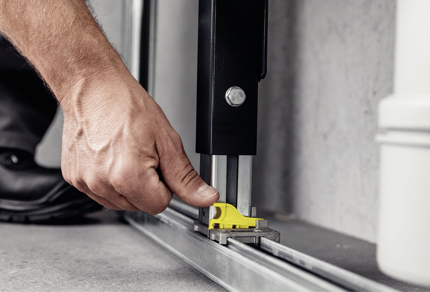 Für die Verschraubung auf dem Boden sind die gleichen Füße zu verwenden – das reduziert die Anzahl an Bauteilen. Die Vorwandelemente haben außerdem Aufnahmen für die Schienenverbinder zum kraftschlüssigen Anschluss an die Konstruktion (Bild 7). Sollen die Elemente hingegen an der Wand festgedübelt werden, sind Aufnahmen für Stockschrauben vorgesehen. Darüber ist die lotrechte Feinjustierung werkzeuglos möglich.
