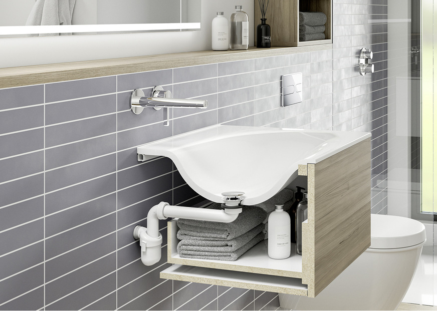 Aufwendig sind häufig die Höheneinstellungen der Traversen für die Wasseranschlüsse am Waschtisch. Eine Lösung bieten Waschtischelemente mit Schnellspanner, die sich werkzeuglos einstellen und arretieren lassen. Wird ein unterfahrbarer Waschtisch gefordert, ist zudem ein raumschaffender Geruchsverschluss optimal, der sich einfach in der Höhe anpassen lässt. Dieser ist auch für den Einbau in Waschtischunterschränke geeignet (Bild 9). Gerade in Kleinbädern werden diese Badmöbel häufig gewählt, weil sie viel Stauraum bieten.