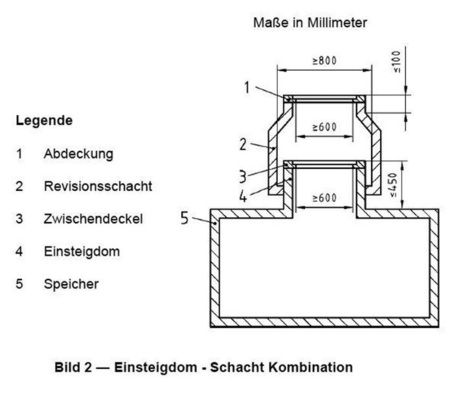 Die Geometrie von Regenspeichern erlaubt es meist nicht, Steighilfen bis zum Boden hin lotrecht übereinander einzubauen. Der Normalfall ist das Einsteigen mit einer Leiter, schräg in die Öffnung gestellt. Allein dafür wird vom nutzbaren Durchmesser ein wesentlicher Teil beansprucht; und umso mehr, je weiter es im Einstiegdom hinunter geht. Damit bei normaler Statur noch ein sicheres Benutzen von Leitern oder Steighilfen gewährleistet ist, dürfen Schachtaufbauten an keiner Stelle weniger als 60 cm Innendurchmesser haben. Wenn sie enger als 80 cm sind, dürfen sie auch nicht höher als 45 cm einschließlich späterer Schachtausgleichsringe sein. Diese Höhe wird außen gemessen zwischen Geländehöhe und Bauteilknick. Bei größerer Höhe muss der Einsteigdom auf mindesten 80 cm Durchmesser erweitert werden, zum Beispiel durch Kombination mit einem Schachtaufbau. In DIN 1989-3 sind dazu drei Varianten abgebildet, mit Bezug auf DIN EN 476, die die erforderlichen Schachtweiten regelt bei „Bauteilen in Abwasserkanälen und -leitungen für Schwerkraftentwässerungssysteme.“ Dieser Querverweis ist eher irreführend als hilfreich, gibt es doch nach DIN EN 476 keine Durchstiege, die weniger als 80 cm Durchmesser haben dürfen. Martin Lienhard hat im Artikel „Einstieg mit Augenmaß“, siehe Literaturliste, darauf hingewiesen. Er bezieht Position mit der Feststellung, es handle sich bei Regenspeichern auf Privatgrund nicht um Abwasseranlagen und begründet dies mit Definitionen aus dem Abwasserabgabengesetz und dem wesentlich geringeren Gefahrenpotential bei Zisternen. Damit sei DIN EN 476 hier nicht angemessen, die Vorgabe der DIN 1989 eher zutreffend.