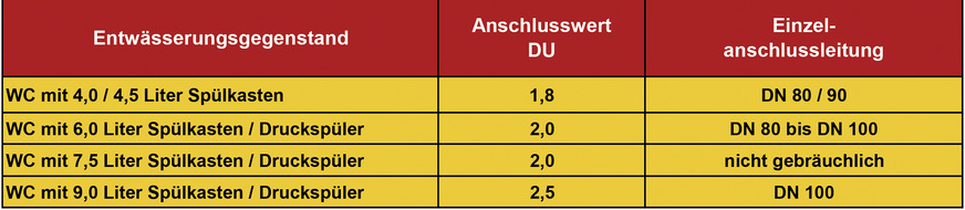 Einzelanschlussleitungen werden gemäß Tabelle 6 der DIN 1986-100 dimensioniert. Für Klosettanlagen mit 4,0-/4,5-l-Spülkasten beträgt der Anschlusswert DU = 1,8; für Klosettanlagen mit 6,0-l-Spülkasten/Druckspüler beträgt der Anschlusswert DU = 2,0 (Bild 1). Die Anwendungsgrenzen für unbelüftete Einzelanschlussleitungen ergeben sich aus dem Abschnitt 14.1.3.1; die für belüftete Einzelanschlussleitungen aus dem Abschnitt 14.1.3.2.