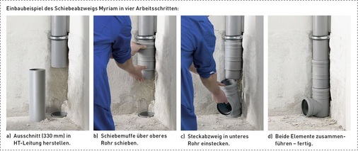 Um diesen Arbeitsvorgang zu erleichtern, hat die in Nürnberg ansässige Otto Haas KG die OHA-HTEA-Schiebeabzweige der Serie Myriam, Lukas und Tara sowie die Reparaturmuffe Michaela entwickelt und Mitte September der Fachpresse vorgestellt. Diese Serie erlaubt es dem Handwerker, in wenigen Minuten und in nur vier Arbeitsschritten einen DN-110-Abzweig in eine bestehende DN-110-HT-Leitung zu setzen, bodenbündig und ohne Einsatz einer Muffe. Dazu wird ein 27cm bzw. 33cm kurzes Stück (je nach Modell) aus der HT-Fallleitung entfernt. „Mit diesem System ist kein lästiges Aufstemmen der Betonplatten mehr notwendig“, erklärt Vertriebs- und Marketingleiter Martin Hanzlik.