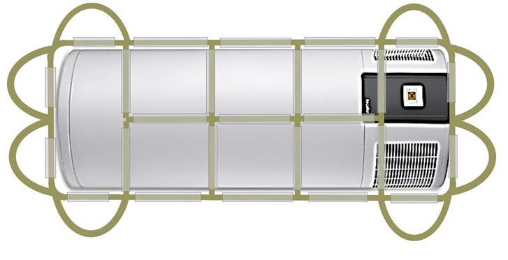 Das Einbringen von Warmwasser-Wärmepumpen durch enge Treppenhäuser ist auch für vier Personen Schwerstarbeit, doch F.Zwei-Tragenetze helfen, diese Tätigkeit zu erleichtern. Das F.Zwei-Tragenetz WWWP ist aus festem Gewebe gespleißt, mit Schutzschläuchen versehen und mit acht Trageschlaufen ausgestattet. Mit der Variante können Warmwasser-Wärmepumpen mit Durchmesser 70 cm und einer Höhe von 190 cm transportiert werden.