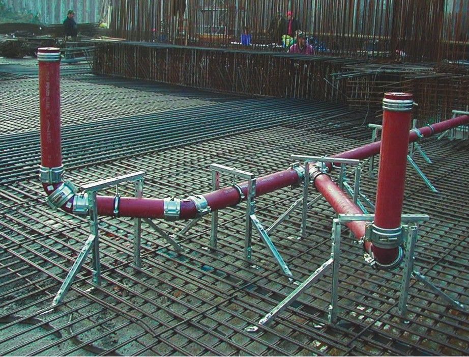 Damit die Leitungen beim Einbringen des Betons in ihrer Lage verbleiben, ist auf eine ausreichende Befestigung - optimal mit Rohrschellen auf Tragkonstruktionen – zu achten (Bild 7). Bei Formstückkombinationen – bestehend aus mehreren Formstücken – ist zur Stabilisierung der Einsatz von zusätzlichen Krallen eine sichere und einfache Lösung. Zum Schutz vor Auftrieb sollen die Leitungen grundsätzlich vor dem Betonieren mit Wasser gefüllt werden. Bei der Planung und Ausführung ist darauf zu achten, dass die Leitungen allseitig mit ausreichend Beton umgeben sind (bei wasserundurchlässigem Beton mindestens 200 mm). Reicht die Dicke der Grundplatte hierzu nicht aus, ist sie an diesen Stellen durch eine sogenannte Voute zu verstärken (Bild 8).