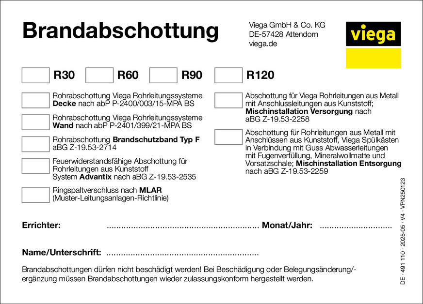 In der Kennzeichnung müssen neben Monat und Jahr der Errichtung der Name der Rohrabschottung (Bezeichnung aus dem Anwendbarkeitsnachweis), die Nummer des Nachweises, das Ausstellungsdatum des angewendeten Nachweises sowie die Angabe, welche Feuerwiderstandsklasse (Zeitdauer) erreicht werden soll, vermerkt sein.