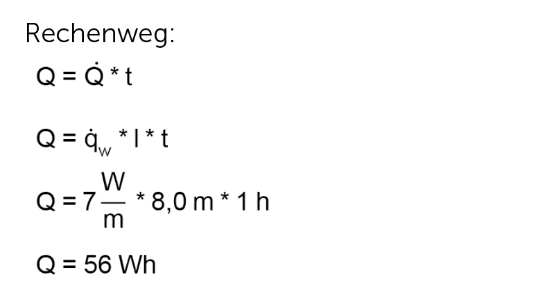 Wie viel allein der Wärmeübergang von Warmwasser führenden Rohrleitungen beispielsweise in einer Vorwand auf die Kaltwasser-Installation ausmacht, zeigt dabei die nachfolgende Berechnung. Ausgehend von einer Rohrlänge von 8 m (l) wird bei einer permanent durchflossenen, durchgeschleiften Zirkulation binnen einer Stunde (t) eine Energiemenge von 56 Wh (Q) in die Vorwand eingetragen. Die Leitungswärmeverluste ( ) werden für die Berechnung mit 7 W/m angesetzt.