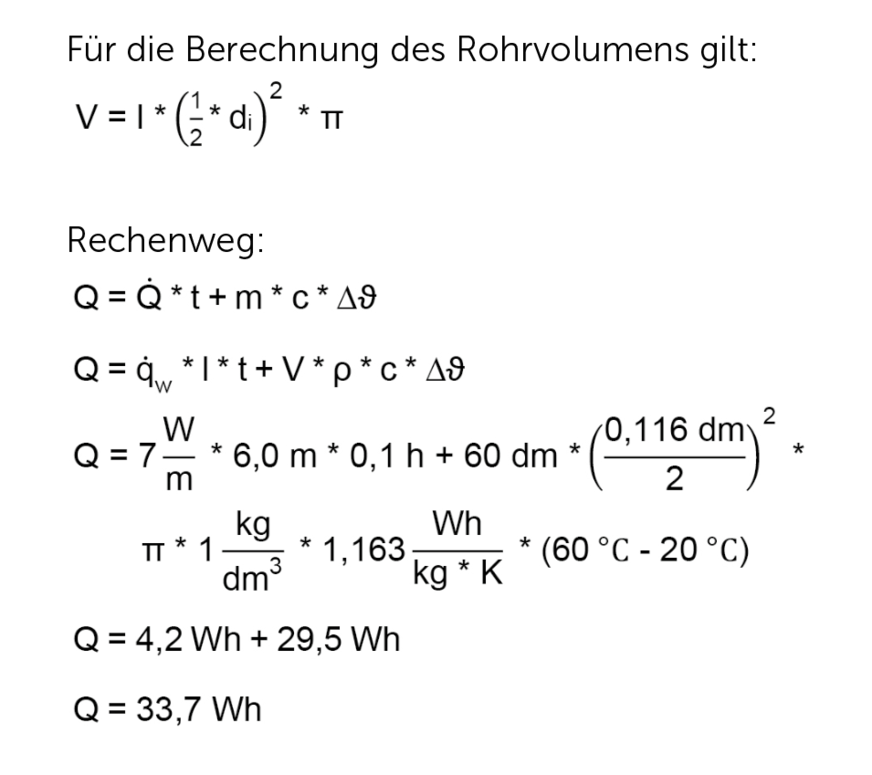 Bei einer nur 6 m langen Reihenleitung (l), da ohne Zirkulationsstrecke, liegt der Wärmeeintrag beispielsweise nach einem sechsminütigen Duschvorgang (t) und anschließender Wiederabkühlung von PWH auf Umgebungstemperatur (Δϑ) lediglich bei 33,7 Wh (Q) – einmalig bei einem Duschvorgang. Anschließend beträgt der Wärmeeintrag 0 Wh. Für den Rechenweg wurden noch folgende Parameter angenommen: