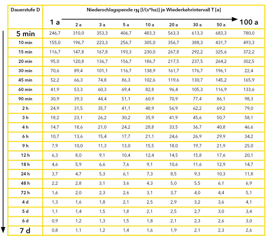 Datenbasis aller Berechnungen ist Kostra-DWD-2020, ein Starkregenkatalog, der vom Deutschen Wetterdienst (DWD) herausgegeben wird. In der Tabelle lassen sich die Regenereignisse der Dauerstufe D, also von fünf Minuten bis zu sieben Tagen, ablesen (Bild G). Dort ist etwa in erster Zeile ein 5-minütiges Jahrhundertregenereignis zu sehen, das innerhalb von fünf Minuten 780 l Regen pro Sekunde und Hektar bringt.