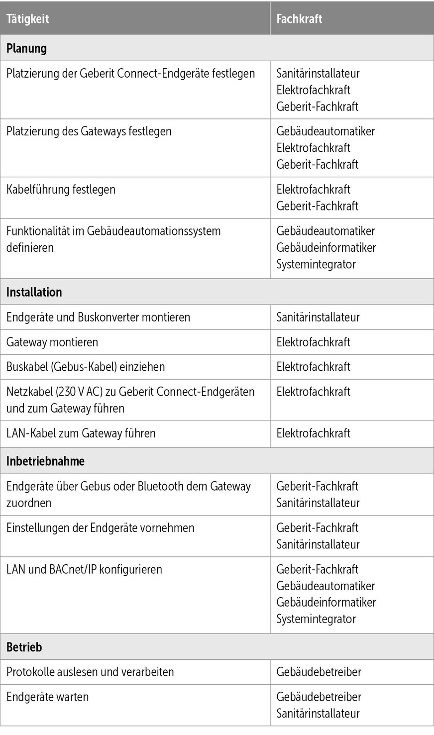 Sanitärgegenstände, die miteinander vernetzt werden sollen, installiert das SHK-Fachhandwerk, wohingegen für den Elektroanschluss (230 V) in der Regel das Gewerk Elektro verantwortlich ist. Dazu zählt auch der Anschluss des Buskabels, wobei eine Abstimmung zwischen den Gewerken notwendig und von Vorteil ist.