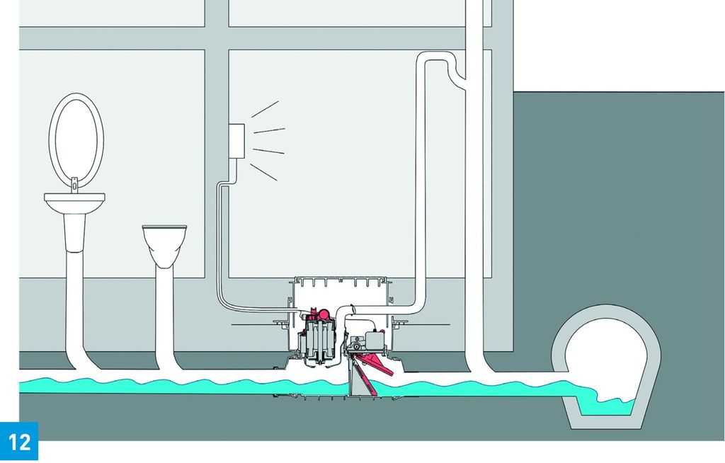 In vielen Fällen, in denen ein natürliches Gefälle zum Kanal besteht und ein Rückstauverschluss eingebaut werden könnte, wird dennoch eine Hebeanlage eingebaut. Das liegt vor allem daran, dass die Bewohner bei Rückstau sonst keine Toilette oder Waschmaschine unterhalb der Rückstauebene benutzen können, da das Abwasser bei geschlossener Rückstauklappe nicht abfließen kann. Die Rückstauhebeanlage Ecolift des Herstellers Kessel bietet hier eine Alternative. Im Normalbetrieb nutzt sie das Gefälle zum Kanal (Bild 12) und pumpt nur bei Rückstau, wenn die Rückstauklappe geschlossen ist und gleichzeitig Abwasser aus dem Haus entsorgt werden muss. Das minimiert den Energieverbrauch und damit die Kosten. Im Gegensatz zu einer klassischen Hebeanlage, die auch dann pumpt, wenn kein Rückstau vorliegt und das Abwasser eigentlich frei in den Kanal ablaufen könnte. Darüber hinaus sorgt die Rückstauhebeanlage dafür, dass auch während eines Stromausfalls die Abwasserentsorgung nicht unterbrochen wird, denn sie nutzt das Gefälle zum Kanal.