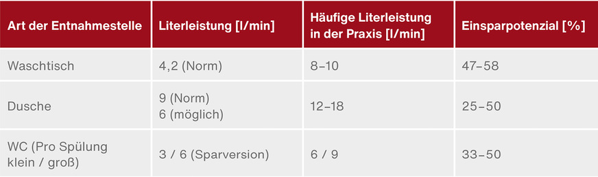 Arens: In Sonderfällen können die normativen Literleistungen sogar unterschritten werden, nämlich bei besonders häufig genutzten Entnahmestellen, wie zum Beispiel in öffentlichen Sanitäranlagen von Flughäfen oder Rathäusern. Hier reichen in aller Regel an Waschtischen 3 l/min statt der häufig feststellbaren 8 bis 10 l/min. Auch die Wassermengen von WCs und Duschen lassen sich oftmals reduzieren: Bei WC-Spulkästen reicht in aller Regel eine 6-Liter-Spülung statt einer 9-Liter-Spülung. Aber auch im privaten Bereich lassen sich beim Duschen hohe Einsparpotenziale erreichen: Bei häufig genutzten Duschen von Mietwohnungen in Mehrpersonenhaushalten reichen aus trinkwasserhygienischen Gründen 6 l/min statt der normativen 9 bzw. den oftmals vorzufindenden bis zu 18 l/min. Hier kann über die Nutzungsfrequenz ein so hoher regelmäßiger und vollständiger Wasserwechsel gegeben sein, dass man auf eine Durchflussmenge von 6 l/min runtergehen kann. Diese Sparmaßnahmen müssen wie gesagt mit Augenmaß und von Fall zu Fall bedacht werden. In einem Bewohnerbad eines modernen Altenheims, wo die Trinkwasser-Installationen an den Waschbecken oft auf 4,2 l/min ausgelegt sind, aber oft eine Durchflussmenge von 8 bis 9 l/min aufweisen, sollte man nichts ändern – hier wird erfahrungsgemäß viel zu wenig Wasser genutzt, sodass eine höhere Durchflussmenge positiv ist. Es ist also hilfreich, sich von Experten beraten zu lassen, um eine individuell sinnvolle Entscheidung zu treffen.