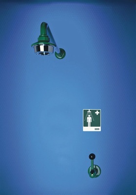 Das zweite Element einer Sicherheitseinrichtung ist die Augen und Gesichtsdusche. Sie soll gemäß der genannten Richtlinie für Laboratorien möglichst im Bereich der Körperdusche oder eines Ausgussbeckens installiert sein. Im Augen- und Gesichtsduschen-Programm stehen Varianten für Wand-, Stand- und Labormöbelmontage bzw. Kombinationen mit Auffangschalen zur Verfügung. Die Sicherheitsarmaturen werden durch Drücken der über den gesamten Handgriff laufenden Grifftaste ausgelöst und sind flexibel in ihrer Handhabung. Bei der stationären Benutzung bleibt der Duschkopf in der Wand- bzw. Standhalterung. Die Hände sind zum Offenhalten der Augen frei. Dabei spült der großflächig austretende, weiche Wasserstrahl beide Augen gleichzeitig sowie das gesamte Gesichtsfeld. Für den konstanten, normgerechten Volumenstrom von 6 l/min bei 1 bar Fließdruck sorgt ein integrierter Durchflussmengenregler.