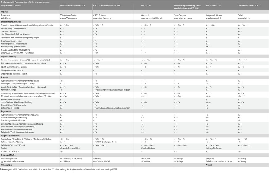 Programme für die Auslegung von Entwässerungsnetzen haben unterschiedliche Zielgruppen. Produktspezifische Programme wie etwa Geberit ProPlanner sind vor allem auf Fachhandwerker zugeschnitten. Mit kostenpflichtigen Lösungen lassen sich Entwässerungsnetze mithilfe entsprechend umfangreicher Bauteildatenbanken durchweg auch produktneutral planen. Zu diesen Lösungen gehören numerische Berechnungsprogramme mit grafischer Darstellung, CAD-Programme mit aufgesetzten Berechnungsmodulen sowie CAE-Lösungen mit integrierter Kalkulation.