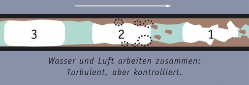 Über die geeignete Vorgehensweise bei der Legionellen-Sanierung eines Gebäudes besteht unter Hygienefachleuten auch mittlerweile Konsens: Um das Legionellenwachstum in Trinkwasseranlagen nachhaltig zu unterbinden, ist ein übergreifendes Systemdenken wichtig. Es müssen sowohl bautechnische wie betriebstechnische und verfahrenstechnische Maßnahmen erwogen werden. Eine eindimensionale Vorgehensweise (beispielsweise sofort und alleinig die Chemie zu bemühen) ist langfristig nicht zielführend. Der Hygieneansatz von Hammann Wasser-Kommunal, Annweiler, geht von der grundsätzlichen Überlegung aus, dass Ablagerungen und der Biofilm aus der Hausinstallation entfernt werden müssen, da diese immer wieder die Quelle für ein Aufkeimen bilden. Schon das DVGW-Arbeitsblatt W 291 führt den Gedanken der Reinigung in Abschnitt 3.3 auf. In Abschnitt 4 heißt es zusätzlich: „Die Entfernung von Verunreinigungen mit Trinkwasser, Trinkwasser/Luft-Gemischen und mechanischen Hilfsmitteln ist der Reinigung mit Reinigungsmitteln grundsätzlich vorzuziehen“. Weiterhin heißt es: „Der Einsatz von Trinkwasser/Luft-Gemischen bietet primär die besten Voraussetzungen für die Reinigung.“ Obwohl das Arbeitsblatt sich ursprünglich auf Transport- und Verteilleitungen der öffentlichen Wasserversorgung bezieht, ist es laut Kommentar zum DVGW-Arbeitsblatt W 551 bis zum Erscheinen eines speziellen Blattes für Hausinstallationen dennoch heranzuziehen. Hammann setzt zur mechanischen Reinigung das Impuls-Spül-Verfahren „Comprex“ ein: Technisch reine, 4-fach gefilterte Luft wird innerhalb eines druckreduzierten Spülabschnitts und impulsartig in die Trinkwasserleitung eingeführt. Sogenannte Luftmolche, die den gesamten Querschnitt des Rohres ausfüllen, wandern im Wechsel mit Wasser durch die Leitungen. Sie erzeugen an den Grenzflächen Luft/Wasser und Luft/Rohrwand Kavitation und Verwirbelungen, die ein sicheres Ablösen aller weichen, mobilisierbaren Ablagerungen mitsamt dem Biofilm-Bewuchs bewirken. Schützende Deckschichten bleiben davon unberührt.