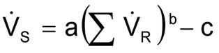 Der Spitzendurchfluss V S ist der maßgebende Durchfluss, für den die Rohrleitungen dimensioniert werden. Der Spitzendurchfluss reduziert unter Berücksichtigung der nutzungsabhängigen Gleichzeitigkeit der Wasserentnahme den Summendurchfluss V R . Der Spitzendurchfluss wird nach folgender Gleichung bestimmt.
