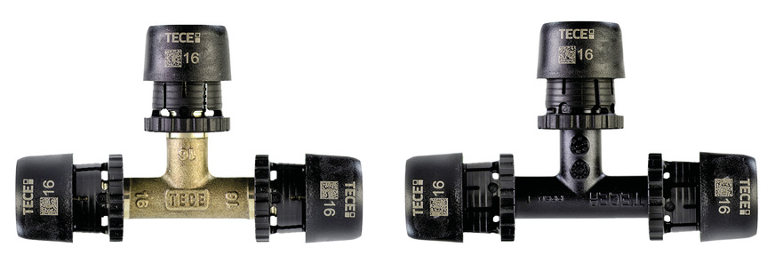 Das neue Fittingprogramm wird aus bleifreier Siliziumbronze (links) und alternativ aus dem Hochleistungskunststoff PPSU (rechts) angeboten.