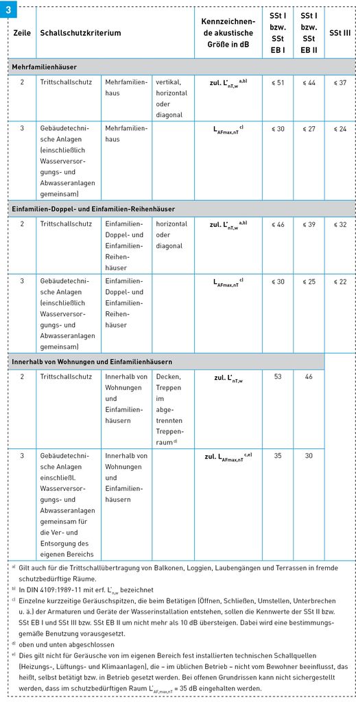 Was ein A-bewerteter Schalldruckpegel LA in Dezibel (dB) ist, wird im nächsten Abschnitt erläutert. Das erscheint auf den ersten Blick unbedeutend zu sein, relativiert sich aber, wenn man bedenkt, dass in den Pegelbereichen, die am Bau bzw. in der Sanitär- und Heizungstechnik bei akustisch erhöhten Anforderungen Bedeutung haben, bereits eine 3 dB-Pegelerhöhung zu einer Verdoppelung der subjektiv wahrgenommenen Lautheit führt. Wie ein Vergleich der Bilder 2 und 3 der VDI 4100 von 2007 bzw. der E VDI 4100 von 2011 zeigt, kommt hinzu, dass in den Schallschutzstufen SSt II und SSt III die Pegel beispielsweise in einem Mehrfamilienhaus von 30 auf 27 dB(A) bzw. von 25 auf 24 dB(A) abgesenkt werden. In Einfamilien-Doppel- und Einfamilien-Reihenhäusern steigen die akustischen Anforderungen an gebäudetechnische Anlagen noch etwas stärker und die zulässigen Schallpegel für gebäudetechnische Anlagen liegen in der SSt II bei 25 dB(A) und in der SSt III bei 22 dB(A), siehe ebenfalls Bild 3. Auch der eigene Bereich ist – wenn auf eine erhöhte Schutzbedürftigkeit Wert gelegt wird – mit 35 dB(A) in der so genannten „Schallschutzstufe I für den eigenen Bereich SSt EB I“ bzw. 30 dB(A) in der SSt EB II in die Anforderungen des neuen Richtlinienentwurfes aufgenommen worden.