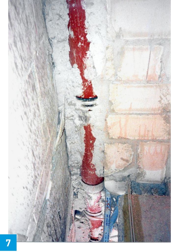Zur Klarstellung und um Missverständnisse zu vermeiden: natürlich wird auch ein Geräusch, das Körperschall erzeugt und über die Rohrleitungen an den Baukörper übertragen wird, vom Baukörper wieder als Luftschall abgestrahlt, denn hören, akustisch wahrnehmen, kann man auch den Körperschall – sieht man von den niederfrequenten, körperlich spürbaren Schwingungen im Infraschallbereich einmal ab – nur als Luftschall. In diesem Zusammenhang sei auf dickwandige, luftschallreduzierte Abwasserrohre aus Kunststoff hingewiesen. Dickwandige Kunststoffrohre haben bei freier Verlegung tatsächlich eine verringerte Luftschallabstrahlung, aber – man muss auch hier das „Kleingedruckte“ und vor allem die akustischen Prüfzeugnisse lesen – die Körperschallübertragung von Abwassergeräuschen, die in unverminderter Höhe entstehen und ebenso unvermindert auf den Baukörper übertragen werden, wenn die Rohre ohne Körperschalldämmung mit dem Baukörper in Berührung kommen, bleibt auch bei diesen Rohren zunächst als Problem erhalten (Bild 7).