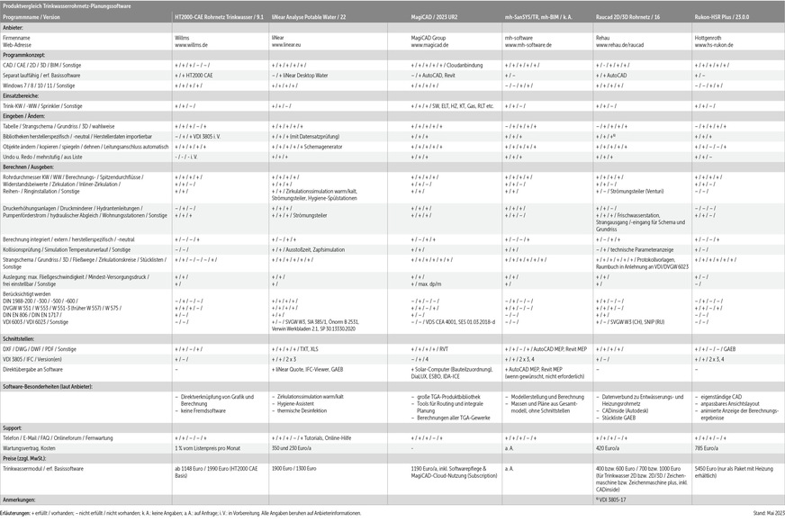 Etwa 25 deutschsprachige Planungsprogramme für Trinkwasserrohrnetze gibt es derzeit (siehe Tabelle und [14]), davon sind 18 Programme in diesem Produktvergleich enthalten. Neben produktunabhängigen Programmen von Softwareherstellern werden auch produktspezifische Berechnungsprogramme von Trinkwassersystem-Herstellern offeriert. Diese beinhalten Rohr-, Formteil- und Ventildatensätze eines Herstellers und unterstützen vor allem Fachhandwerker bei der rationellen Planung, Kalkulation und Bestellung.
