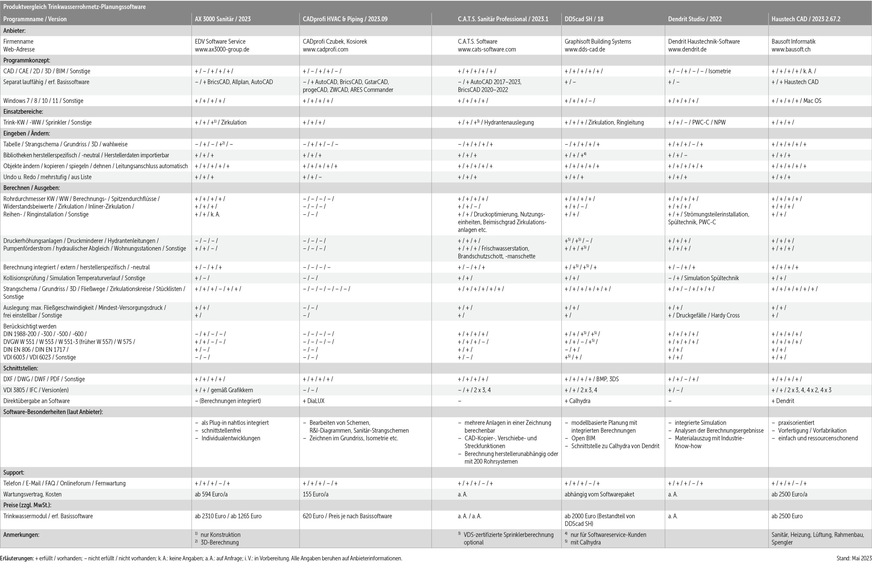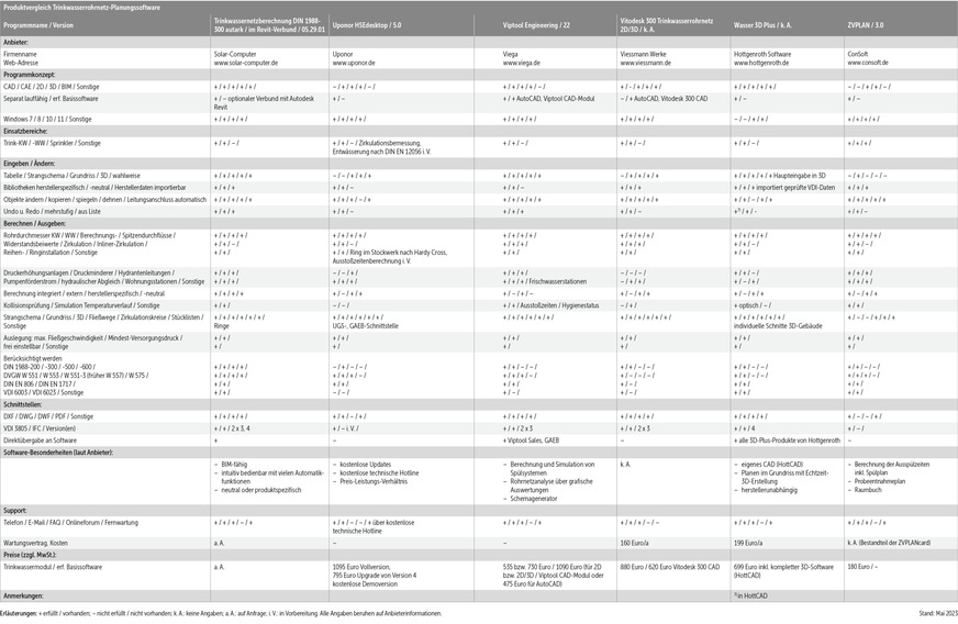 Gegenüber der vereinfachten Bemessung nach der DIN EN 806‑3 [4], die nur für Objekte mit maximal sechs Wohneinheiten und nur unter bestimmten Voraussetzungen zulässig ist, erfasst die nationale Ergänzungsnorm DIN 1988‑300 alle Einflussfaktoren präziser und detaillierter. Nahezu alle in der nachfolgenden Vergleichstabelle vorgestellten Programme offerieren eine Trinkwasserrohrnetz-Berechnung gemäß DIN 1988‑300. Zusätzlich werden die DVGW-Arbeitsblätter W 551 [6], W 551-3 (früher W 557) [7], W 553 [8] und W 575 [9] sowie weitere Richtlinien berücksichtigt.