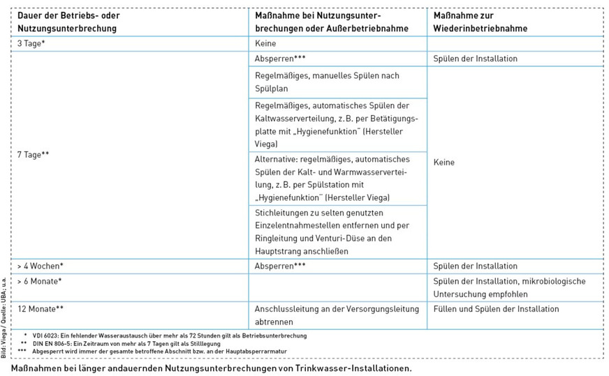 Trotzdem wird es in der Folge immer wieder Situationen geben, in denen dieser bestimmungsgemäße Betrieb nicht eingehalten werden kann. Typische Beispiele dafür sind im Privathaus Abwesenheit aufgrund eines längeren Urlaubs oder im Bürogebäude die Betriebsferien eines Unternehmens. Wird der bestimmungsgemäße Betrieb in dieser Zeit nicht durch automatisierte Systeme unterstützt, sind geeignete Maßnahmen zu ergreifen. Das Umweltbundesamt hat dazu eine Empfehlung herausgegeben (siehe Tabelle unten), die der Dokumentation der Trinkwasser-Installation beigefügt werden sollte.