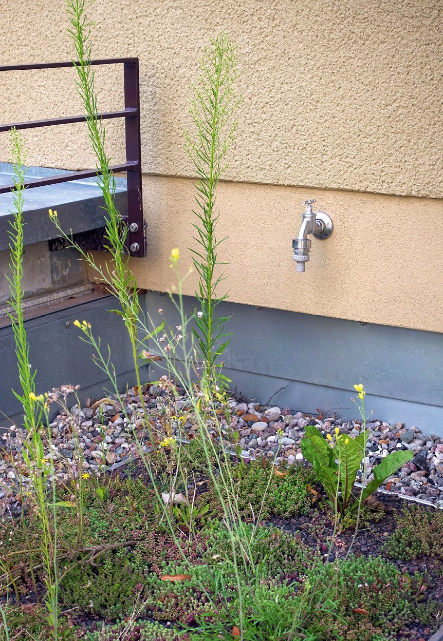 Bei vollem Speicher wird das Regenwasser automatisch, zur Versickerung in einer Mulde, an die Oberfläche gepumpt. Da der Boden wenig durchlässig ist und das Wasser dadurch sehr langsam versickert, ist eine bestimmte Aufnahmekapazität des Regenspeichers als Puffer vor der Sickermulde wichtig. Zusätzliche Rückhaltung erfolgt auf dem begrünten Retentionsdach mit besonders großem Speichervolumen und einer insektenfreundlichen Saatgutmischung namens „Bienenweide“. Der nächste logische Schritt wäre, die Biodiversität zu optimieren und Bienenvölker auf solchen Gründächern anzusiedeln.