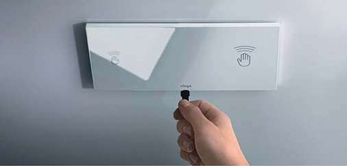 Die sensitive „Visign for care”-Betätigungsplatte mit Funktion Hygiene+ kann mit allen Visign-Spülkästen von Viega kombiniert werden. Als einbaufertige Einheit verfügt sie über eine programmierbare Elektronik, über die sowohl die Spülintervalle – ein bis drei Mal wöchentlich – als auch die dann gewünschte Spülmenge – zwischen drei und neun Liter – unabhängig von den normalen Spülmengen eingestellt wird. Außer einen 230-V-Anschluss sind keine Kabel für Sensoren oder ähnliches notwendig. Die Programmierung geschieht über einen mitgelieferten Magnetschlüssel an den Sensorflächen der Betätigungsplatte. Die Besonderheit dieses Spülsystems liegt darin, dass nur dann gespült wird, wenn keine Nutzung erfolgt: Die Betätigungsplatte erfasst jede manuelle Betätigung nach Benutzung der Toilette und berechnet danach das eingestellte Zeitintervall bis zur nächsten Spülung neu. Da zusätzlich zum Zeitintervall das Volumen auf das der vorgelagerten Installation einstellbar ist, wird also bedarfs- und volumengerecht nur so viel gespült, wie dies für den Erhalt der Wassergüte notwendig ist.