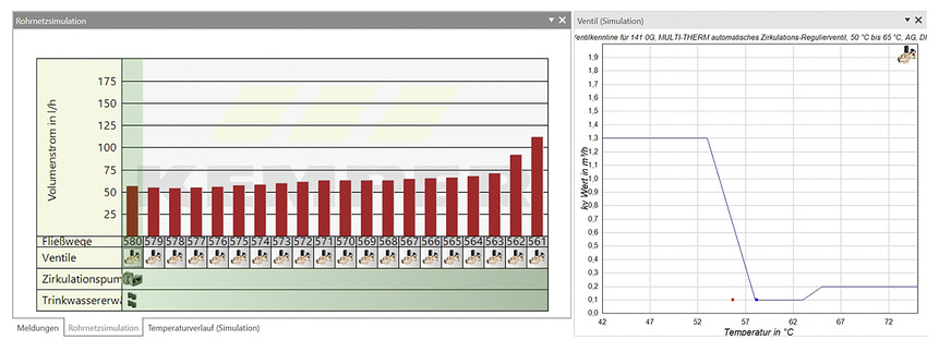 Mit einer nachfolgenden Simulationsrechnung können die aus den veränderten Einstellungen resultierenden Auswirkungen auf den Zirkulationsvolumenstrom und die Temperaturen des zirkulierenden Wassers überprüft werden.