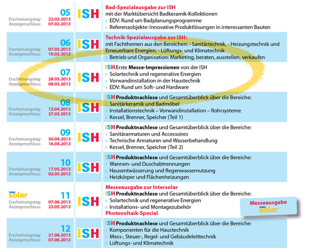 Nur in der SBZ finden Sie die ISH-Neuheiten so kompakt, umfassend und nach den einzelnen Produktbereichen sortiert. Damit Sie auch wissen, welche Themenbereiche wir in welchen Ausgaben behandeln, die nachfolgende Übersicht. Es lohnt sich also einmal mehr, keine SBZ-Ausgabe zu verpassen!